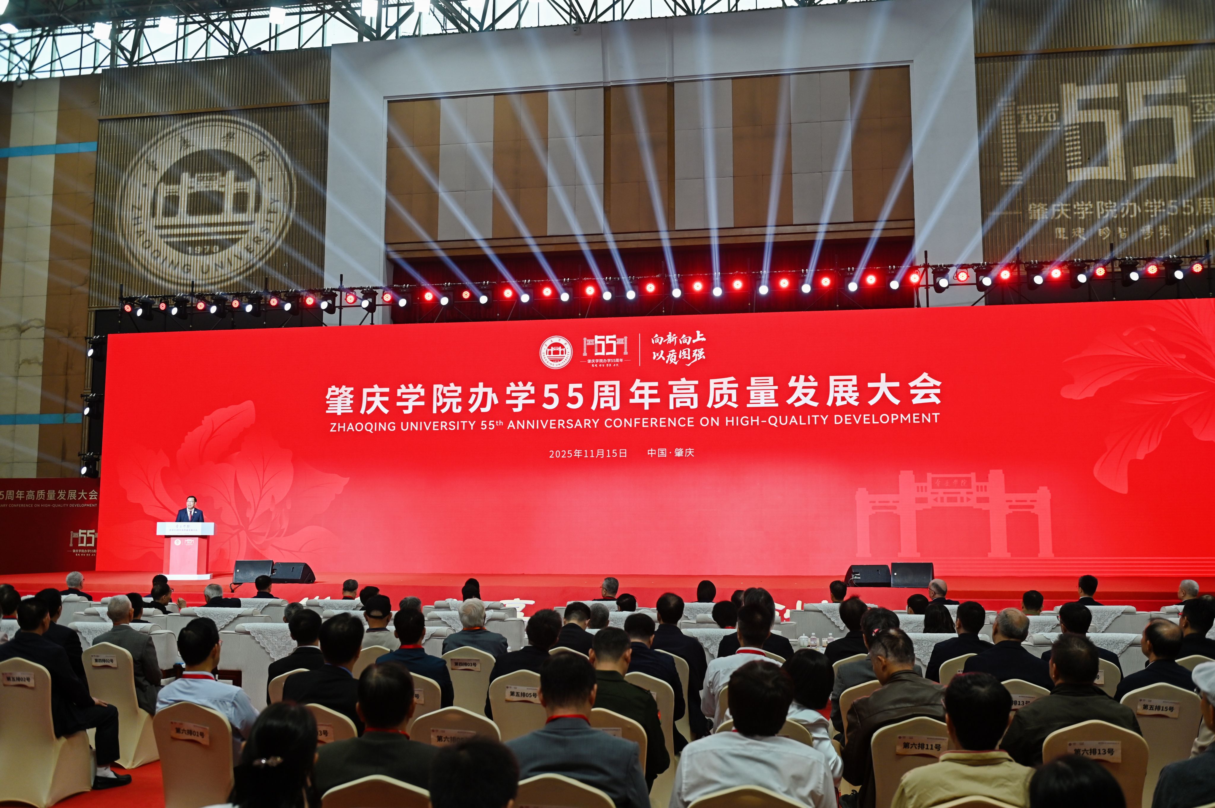本網(wǎng)訊 金風(fēng)送爽,翰墨留香,五十五載春秋榮光。11月15日,學(xué)校以"向新向上,以質(zhì)圖強(qiáng)"為主題,在體育館舉行辦學(xué)55周年高質(zhì)量發(fā)展大會(huì),回顧學(xué)校55年來(lái)辦學(xué)歷程,開(kāi)啟新征程高質(zhì)量發(fā)展美好篇章。肇慶市委書(shū)記,市人大常委會(huì)主任張愛(ài)軍,中國(guó)科學(xué)院院士、華南理工大學(xué)教授吳碩賢,中國(guó)音協(xié)管樂(lè)學(xué)會(huì)主席、中國(guó)人民解放軍軍樂(lè)團(tuán)原團(tuán)長(zhǎng)、國(guó)家一級(jí)指揮于海,廣東省文史館館員、著名書(shū)法家、書(shū)法理論家、詩(shī)人、作家孔見(jiàn),肇慶市人民政府副市長(zhǎng)鄒瑩,肇慶市政協(xié)副主席陳宣群,波蘭密茲凱維奇大學(xué)副校長(zhǎng)拉法爾·維特科夫斯基,波蘭密茲凱維奇大學(xué)副校長(zhǎng)米哈烏·巴納沙克,馬來(lái)西亞沙撈越大學(xué)副校長(zhǎng)菲特里·蘇拉亞,泰國(guó)格樂(lè)大學(xué)副校長(zhǎng)羅勇,澳門(mén)圣若瑟大學(xué)副校長(zhǎng)農(nóng)韻淇等受邀出席本次大會(huì)。此外,來(lái)自省、市有關(guān)區(qū)、縣,國(guó)(境)外合作高校、省內(nèi)外兄弟院校、合作企業(yè)的代表,中專(zhuān)職校、中小學(xué)的校長(zhǎng)與教師代表,海內(nèi)外校友及校友會(huì)負(fù)責(zé)人,社會(huì)各界來(lái)賓、新聞媒體,以及學(xué)校老領(lǐng)導(dǎo)、現(xiàn)任領(lǐng)導(dǎo)、離退休老同志和師生代表等兩千余人蒞臨現(xiàn)場(chǎng)參會(huì),近十萬(wàn)名觀眾通過(guò)線上直播平臺(tái)觀看并互動(dòng)。校黨委書(shū)記謝冠華主持高質(zhì)量發(fā)展大會(huì),校長(zhǎng)李琴作主題報(bào)告。