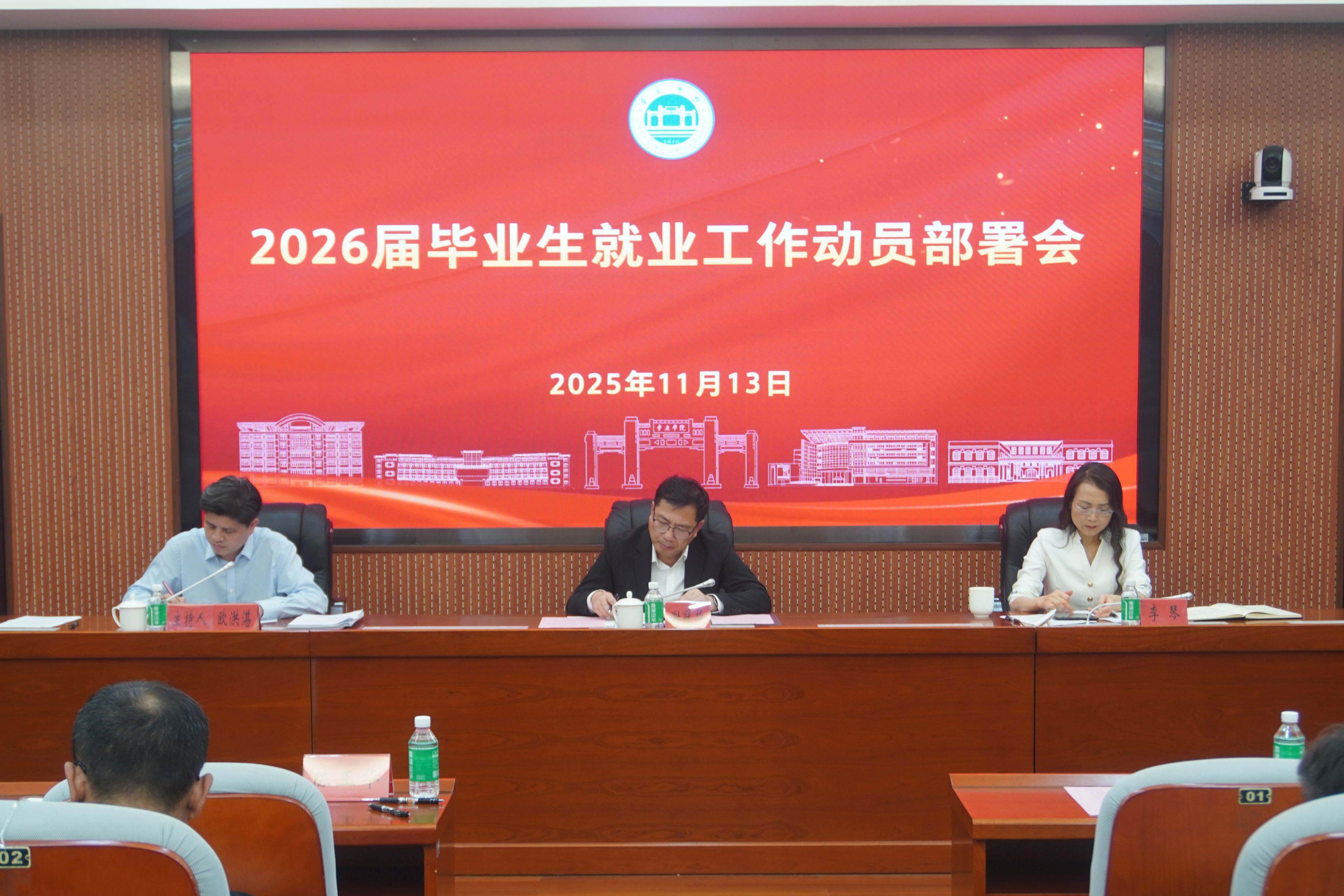 本網訊 11月13日,2026屆畢業生就業工作動員部署會在學校第二會議室召開。校黨委書記謝冠華、校長李琴、黨委副書記歐洪湛出席,相關職能部門負責人、二級學院黨委書記、院長、黨委副書記及輔導員參加會議。會議由歐洪湛主持。