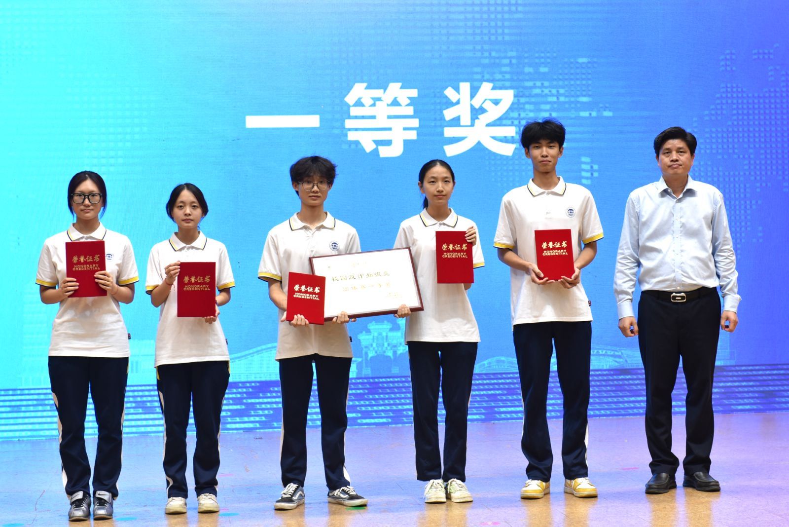 本次競賽初賽通過線上答題方式進行,全校共有2萬4千余名學生參加,最終有8個學院40名選手的代表隊入圍團體決賽。競賽通過現場答題、反詐情景劇表演、辯論賽等多種形式結合展開。經過多輪鏖戰,最終馬克思主義學院隊以總分第一的成績獲團體賽一等獎,其余隊伍分別獲二等獎、三等獎以及優秀獎,最后,我校黨委副書記歐洪湛和現場領導嘉賓為獲獎隊伍、個人賽獲獎選手、優秀教師頒發了榮譽證書。