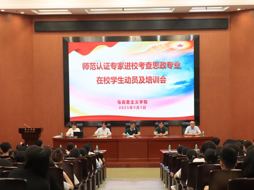 本網訊 9月3日晚,馬克思主義學院在圖書館報告廳召開師范認證專家進校考查思政專業在校學生動員及培訓會。學院領導班子、全體班主任、輔導員及全體思政專業在校學生參加會議。