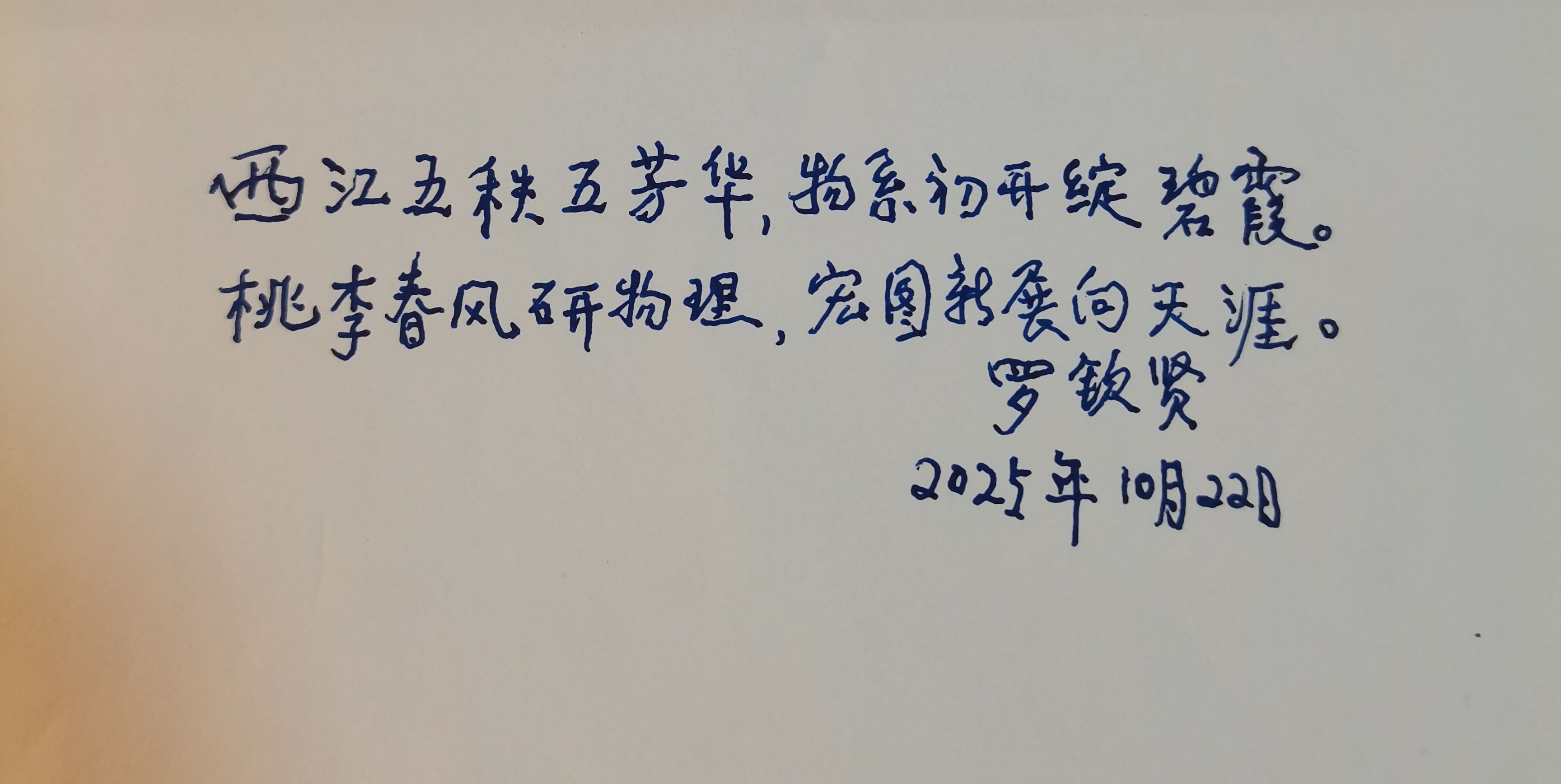 交流中,羅欽賢深情回憶了在物理系工作的難忘時(shí)刻,對物理系、學(xué)院取得的成績表示欣慰,并對學(xué)院未來的發(fā)展充滿信心,表示會(huì)繼續(xù)發(fā)揮余熱,支持學(xué)校、學(xué)院事業(yè)發(fā)展。隨后,他還欣然提筆,寫下了對學(xué)校辦學(xué)55周年的祝福。