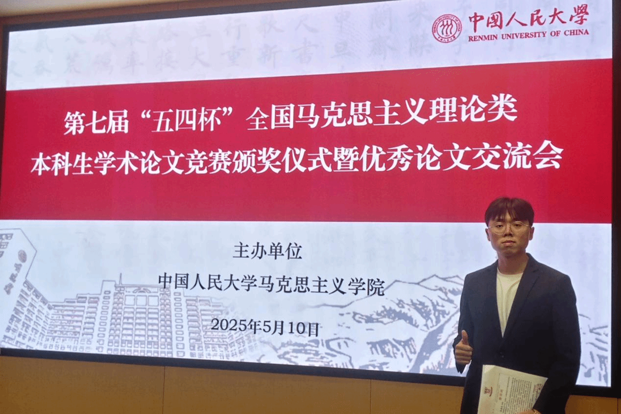 本網(wǎng)訊 5月10日,第七屆“五四杯”全國(guó)馬克思主義理論類(lèi)本科生學(xué)術(shù)論文競(jìng)賽頒獎(jiǎng)儀式暨優(yōu)秀論文交流會(huì)在中國(guó)人民大學(xué)舉行。馬院2023級(jí)思想政治教育專(zhuān)業(yè)學(xué)生林嘉慶撰寫(xiě)的《大國(guó)競(jìng)爭(zhēng)視閾下新質(zhì)生產(chǎn)力的分合二重性》作為優(yōu)秀論文代表受邀參會(huì)。