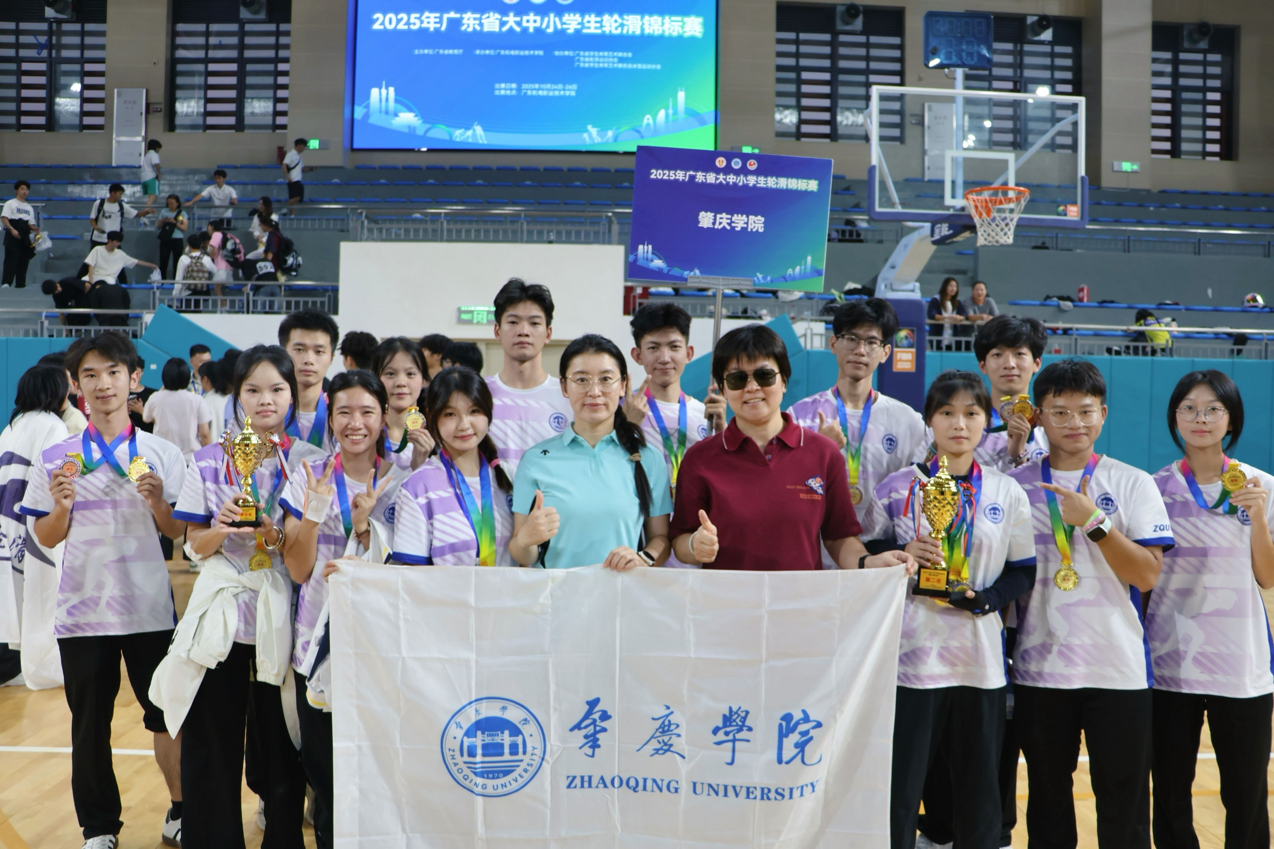 本網訊 10月24日至26日,由廣東省教育廳主辦的2025年廣東省大學生輪滑錦標賽在廣東機電職業技術學院精彩上演。我校輪滑隊由體育與健康學院副院長王娟任領隊,李靈超、殷瑞老師擔任教練員,共派出甲、乙兩個組別的14名隊員參賽,憑借出色發揮,共奪得5枚金牌、3枚銀牌、4枚銅牌的優異成績,并獲多項第四名至第八名,展現了我校學子強大的競技實力與昂揚的精神風貌。