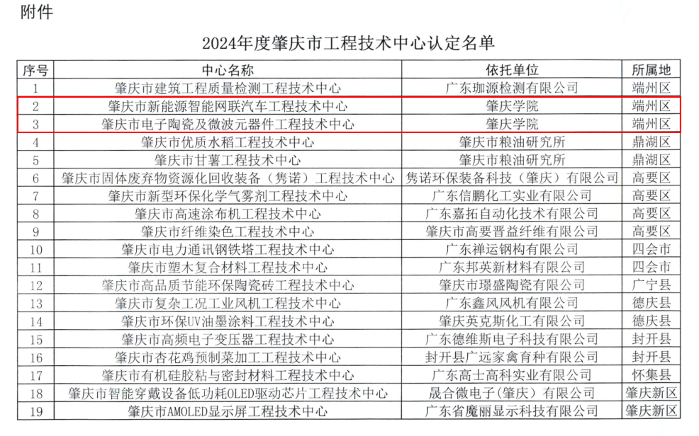 本網訊 近日,肇慶市科學技術局、肇慶市工業和信息化局聯合印發了《關于認定2024年度肇慶市工程技術中心的通知》(肇科〔2025〕2號),我校成功獲批兩個市級工程技術中心,分別為李劍英副教授申報的《肇慶市新能源智能網聯汽車工程技術中心》、陳元斌教授申報的《肇慶市電子陶瓷及微波元器件工程技術中心》。