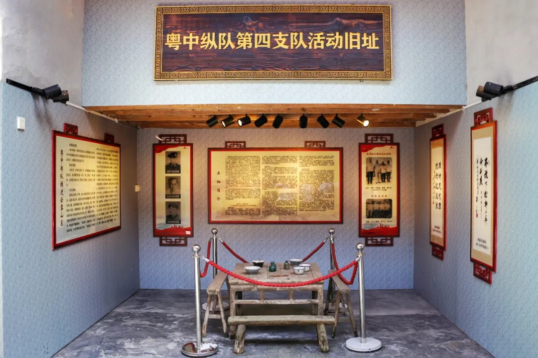 這是一間小房子,外墻砌青磚,屋頂蓋瓦片,門的兩旁懸掛著“愛國主義教育基地”等牌匾。跨過門檻,正前方是一個方方正正的天井。環顧四周,舊址修繕良好,處處細節還原歷史,墻上的掛牌清楚地講述了粵中縱隊第四支隊的革命歷史。