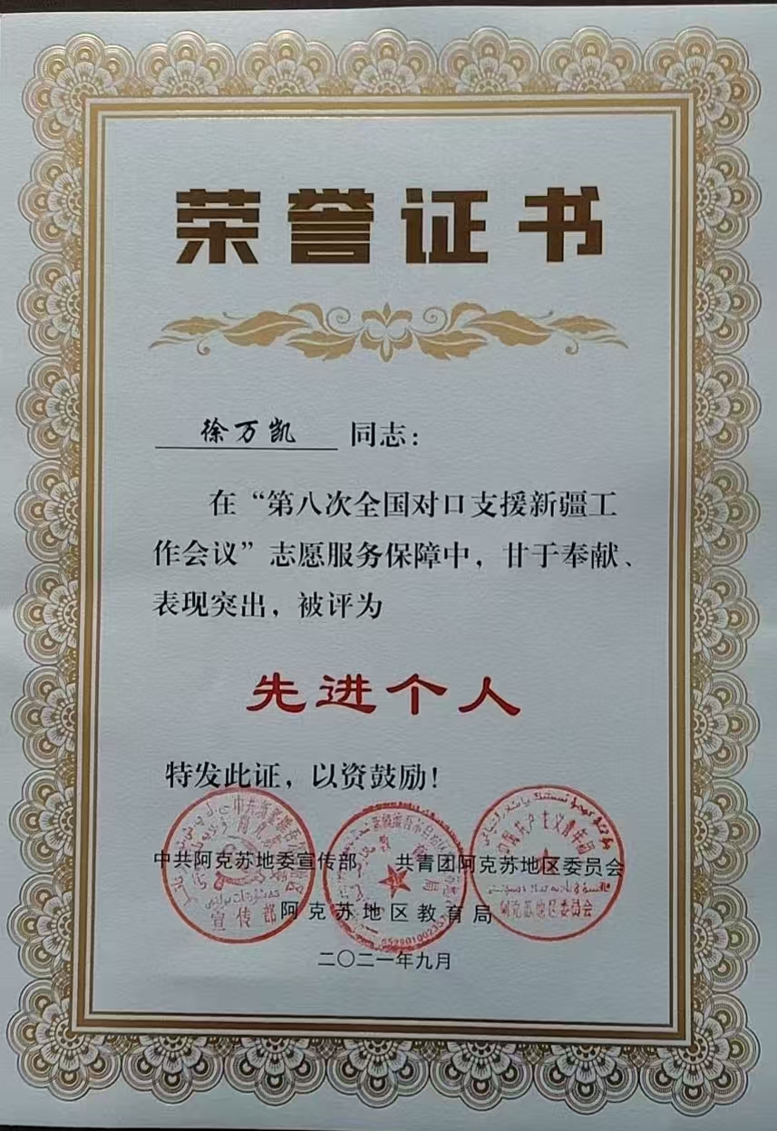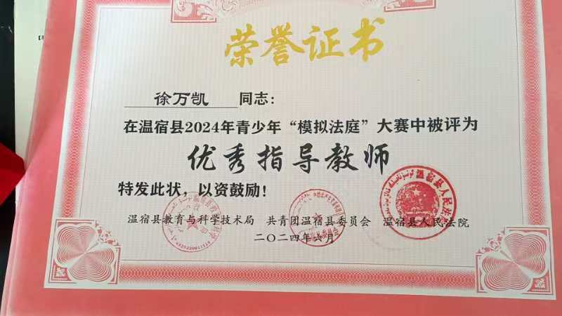 徐萬凱始終堅持“立德樹人”的根本任務,將德育工作融入教育教學全過程。他關心愛護每一位學生,特別是對學習困難學生給予更多關注和幫助。他經常利用課余時間與學生談心,了解他們的學習和生活情況,幫助學生解決實際困難。在他的關懷下,許多學生走出了心理困境,重新找回了自信和快樂。五年來累計資助貧困學生10名,無償給學生提供4000余元的學習用品,家訪行程累計2000余公里,幫助50余名學生解決學習困難。在2024年溫宿縣青少年模擬法庭大賽中,他指導學生深入研究案例,理解法律精神,將物理學科培養的邏輯思維與法庭辯論所需的嚴謹論證相結合。他指導的團隊最終獲得優異成績,他本人也被評為優秀指導教師。