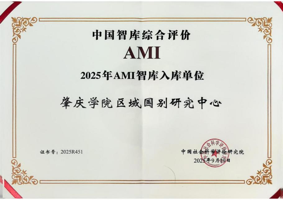 本網訊 近日,中國社會科學院研究院公布2025年度AMI智庫入庫單位名單,肇慶學院區域國別研究中心憑借其在區域與國別研究領域的扎實積累、豐碩成果與良好聲譽,成功入選并獲頒“2025年AMI智庫入庫單位”證書(證書號:2025R451),本次獲評意味著我校區域國別研究中心在智庫建設與咨政服務方面邁上新臺階。