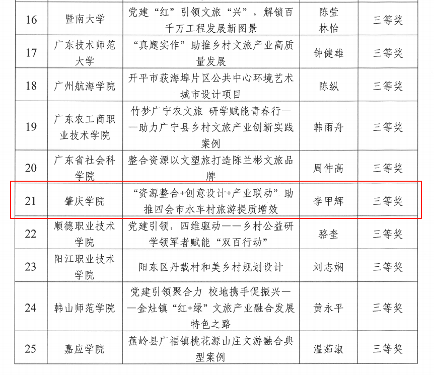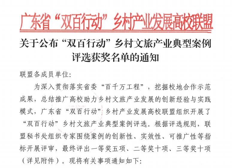 本網訊 近日,廣東省“雙百行動”鄉村產業發展高校聯盟公布鄉村文旅產業典型案例評選結果,我校提報的《“資源整合+創意設計+產業聯動”助推四會市水車村旅游提質增效》案例榮獲三等獎。該案例以鮮明的主題、突出的創新性與實效性入選省級典型,這也是我校“雙百行動”項目繼廣東省“粵美鄉村”風貌設計大賽(獲4項三等獎)、廣東省高校“鄉村創新”藝術設計大賽(獲19項省級獎項,其中二等獎1項、三等獎1項)后,再度獲得的省級榮譽。
