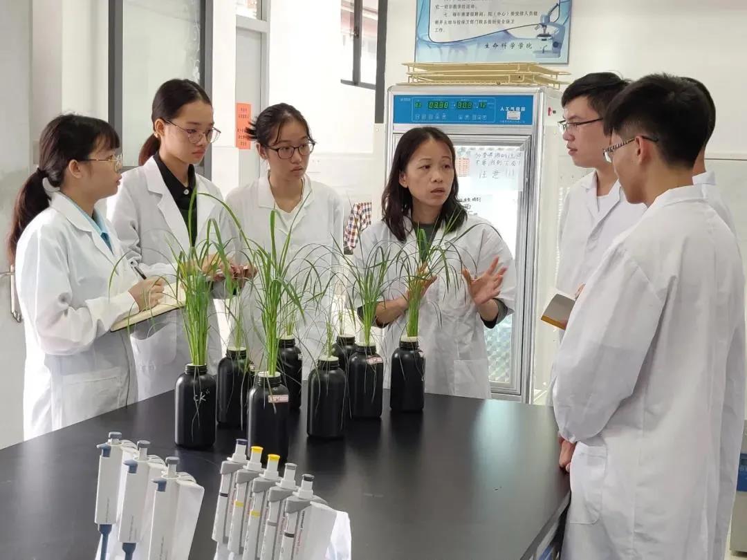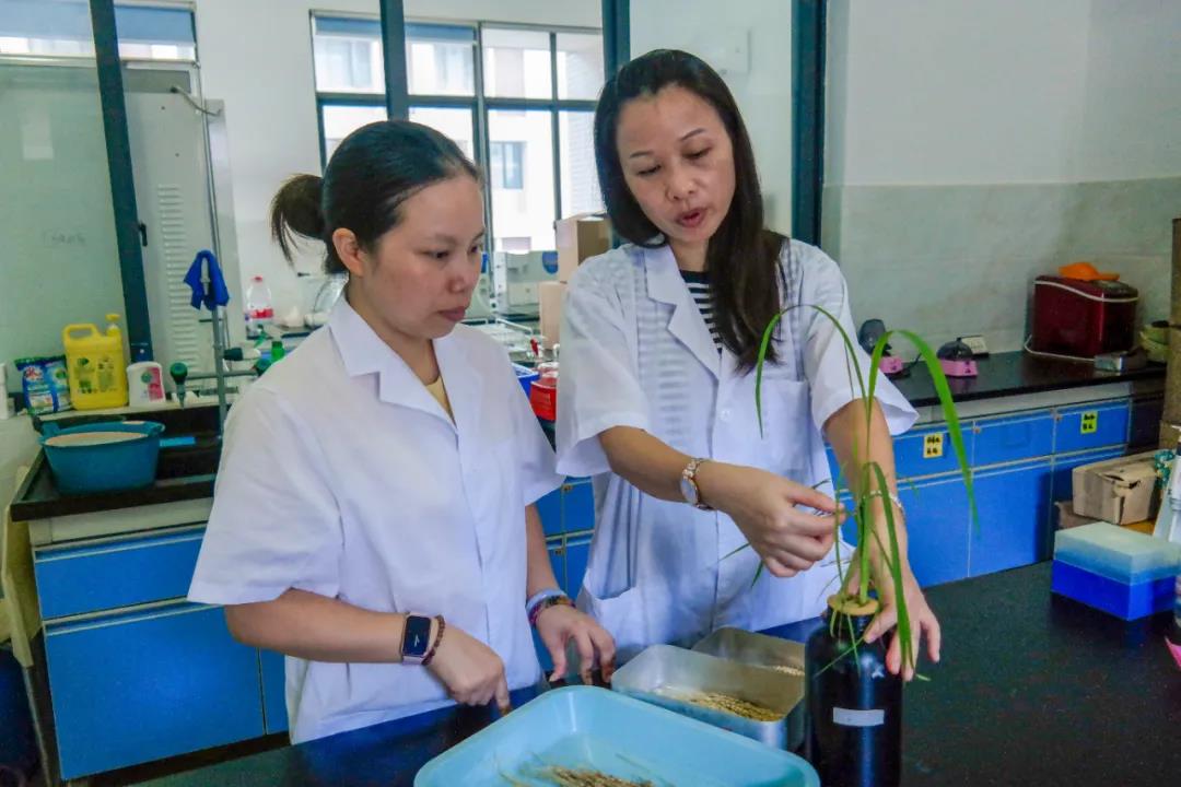 其次是工作的開展。培養(yǎng)水稻等植物材料生長緩慢,受季節(jié)限制大,為滿足實驗材料的需求必須大規(guī)模種植,但是又與轉基因涉及的倫理知識相悖;科研的基礎設備與儀器跟不上研究的步伐,缺乏指標性策略做支撐;同時又因為疫情影響,學生在假期期間不能留校做實驗……重重關卡,俞樂與她的團隊一一破解。不能大規(guī)模培養(yǎng)材料,就在我校生物園大田基地種植,發(fā)展人工氣候項目;水稻受季節(jié)限制大,怕錯過了水稻生長的最佳時間,老師和學生便主動縮短假期,輪流回??醋o水稻;基礎設備和儀器跟不上,俞樂便親自送樣,奔波于廣州的各個合作機構;缺乏指標性的策略,俞樂和她的團隊就慢慢研究摸索……關關難過關關過,長路漫漫亦燦燦。