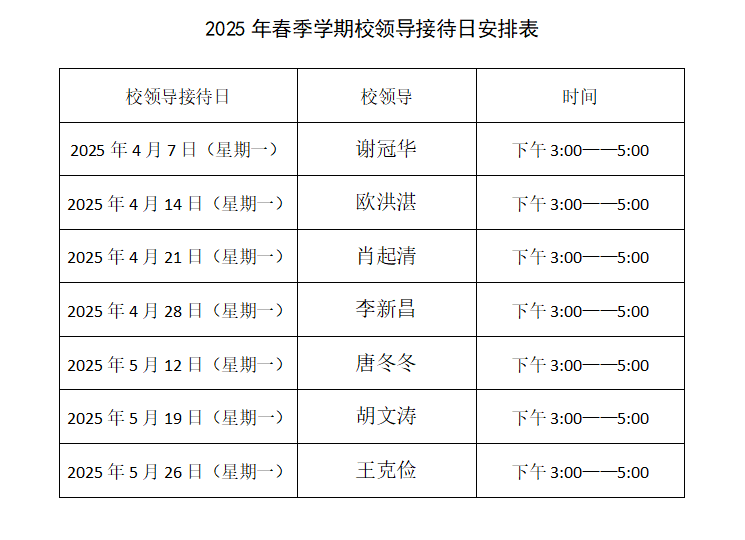 請有意來訪的師生員工于校領導接待日的前一周周五下午17:00前填寫附件1-《肇慶學院校領導接待日預約登記表》并發送至電子郵箱xxdb@zqu.edu.cn進行預約,黨政辦公室協調安排后,將通知預約人具體接待時間。