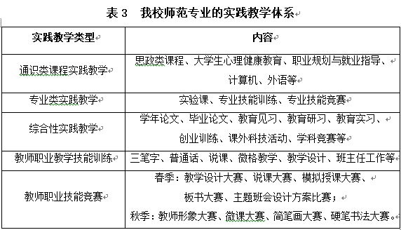 我校把“綜合素質(zhì)高、實踐能力強、學(xué)科基礎(chǔ)扎實、符合基礎(chǔ)教育需要”作為師范專業(yè)人才的培養(yǎng)目標,以提升學(xué)生綜合素質(zhì)和實踐能力為核心,將課程教學(xué)與技能競賽活動相互融合、相互滲透,由此建立有利于師范生實踐技能提升的技能競賽體系,并在此基礎(chǔ)上構(gòu)建有利于大學(xué)生實踐能力和創(chuàng)新能力培養(yǎng)的通識教育、學(xué)科基礎(chǔ)、專業(yè)教育、雙創(chuàng)教育相互銜接、課內(nèi)與課外、校內(nèi)與校外相互聯(lián)動的多元化實踐教學(xué)體系。