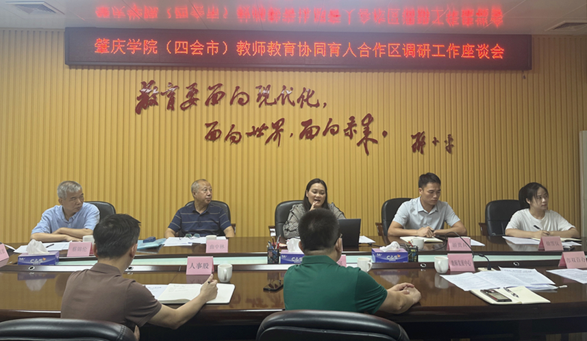 會上,四會教育局副局長唐達強介紹了四會市的基礎教育情況,提出了當前亟待解決的問題,希望與肇慶學院攜手助力四會市基礎教育高質量發展。團隊負責人、教師教育學院副院長薄艷玲介紹了肇慶學院在地方教育幫扶的相關經驗與成果。雙方就教師教育協同育人合作方案進行了深入探討,并達成初步共識。