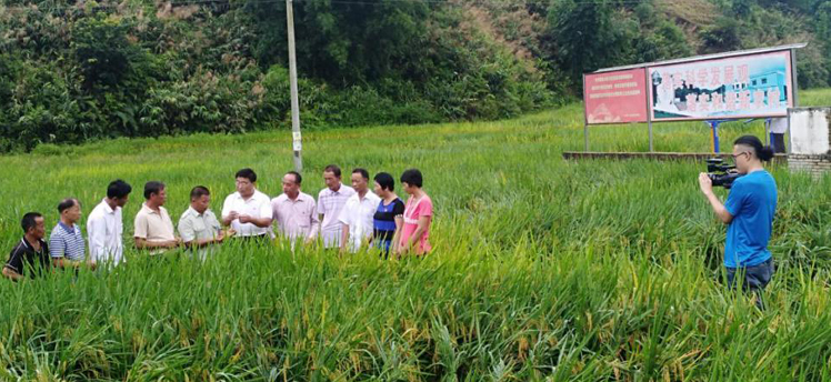 張寶杰教授(中)在德慶縣播植鎮文定村幫助貧困戶提高富硒水稻種植技術和產量
