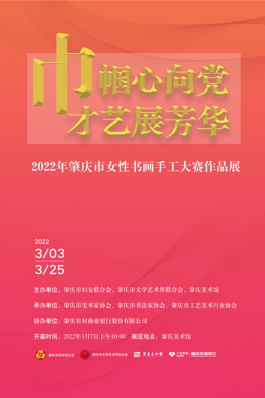 為深入貫徹習近平新時代中國特色社會主義思想,貫徹落實習近平總書記關于婦女和婦女工作的重要論述,傳承中華優秀傳統文化,弘揚工匠精神,助力鄉村振興,以實際行動迎接黨的二十大勝利召開,在“三八”國際婦女節即將到來之際,我們舉辦了“巾幗心向黨 才藝展芳華——2022年肇慶市女性書畫手工大賽”。大賽由肇慶市婦女聯合會、肇慶市文學藝術界聯合會、肇慶美術館主辦,由肇慶市美術家協會、肇慶市書法家協會、肇慶市工藝美術行業協會承辦,肇慶農村商業銀行股份有限公司協辦。