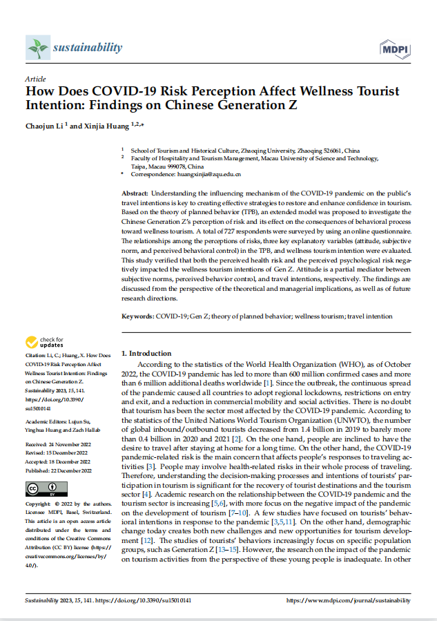 近日,國際學(xué)術(shù)期刊《sustainability》刊發(fā)我院李朝軍、黃心甲合作論文《How Does COVID-19 Risk Perception Affect Wellness TouristIntention: Findings on Chinese Generation Z》。據(jù)悉,《sustainability》是SSCI和SCI雙檢索期刊,均為JCR數(shù)據(jù)庫2區(qū)。