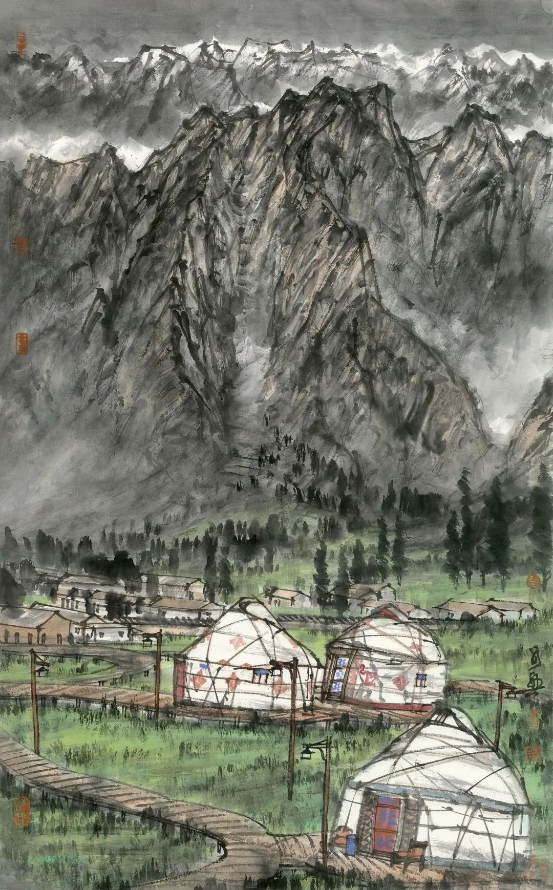 陳水興《巴里坤湖畔人家》 紙本設(shè)色 97x60cm 2022年