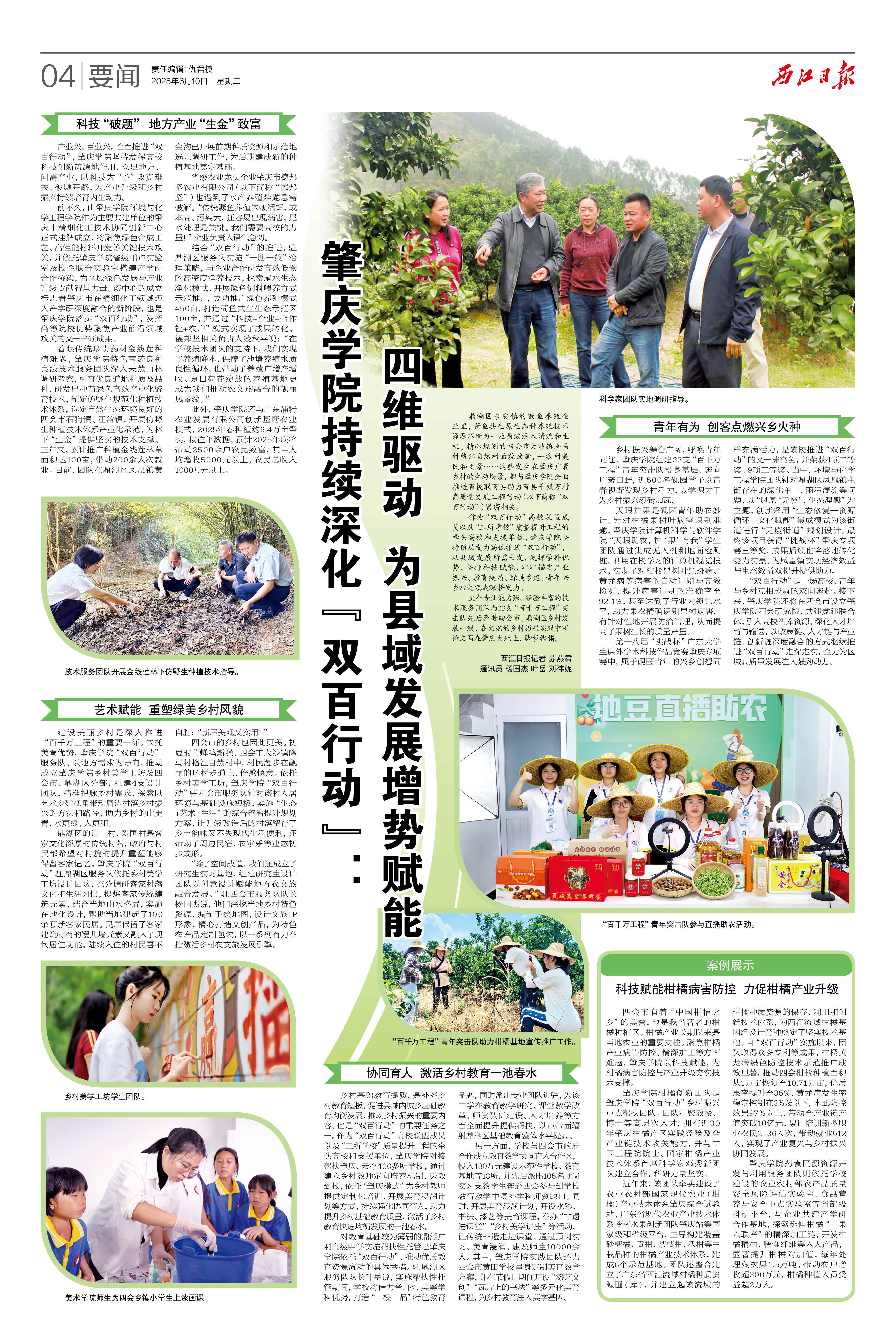 作為“雙百行動”高校聯盟成員以及“三所學校”和縣中質量提升工程的牽頭高校和支援單位,肇慶學院堅持頂層發力高位推進“雙百行動”,從縣域發展所需出發,發揮學科優勢、堅持科技賦能,牢牢錨定產業振興、教育提質、綠美鄉建、青年興鄉四大領域深耕發力。