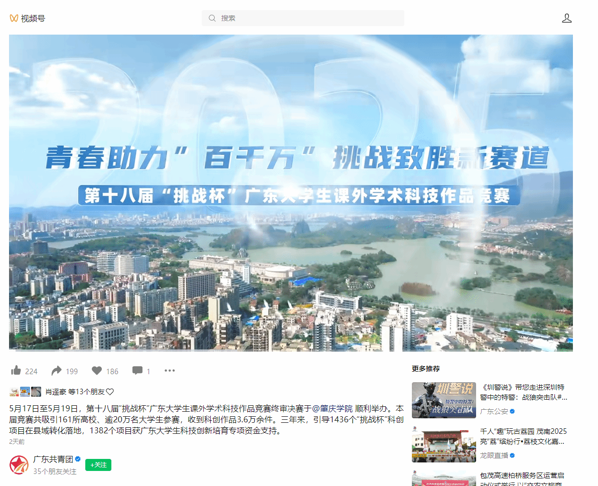 5月17日至5月19日,第十八屆“挑戰杯”廣東大學生課外學術科技作品競賽終審決賽于@肇慶學院 順利舉辦。本屆競賽共吸引161所高校、逾20萬名大學生參賽,收到科創作品3.6萬余件。三年來,引導1436個“挑戰杯”科創項目在縣域轉化落地,1382個項目獲廣東大學生科技創新培育專項資金支持。