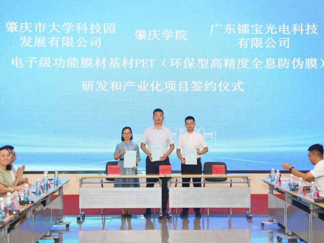 在前期校企深入對接的基礎上,本次活動現場校方與企業簽訂了4項協議:◆ 一是與廣東鐳寶光電科技有限公司簽訂電子級功能膜材基材PET(環保型高精度全息防偽膜)的研發和產業化項目,實現填補國內技術空白;