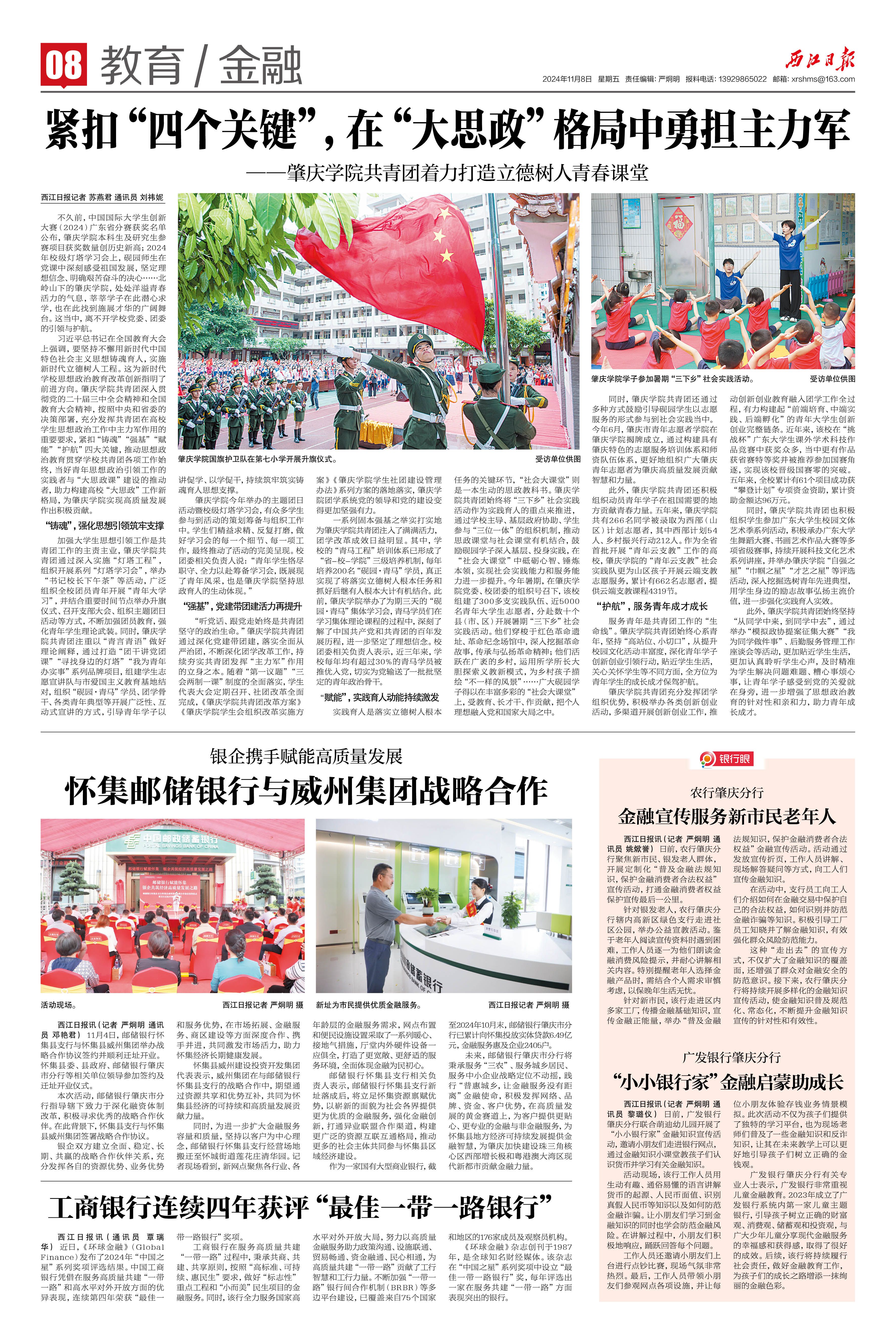 習(xí)近平總書(shū)記在全國(guó)教育大會(huì)上強(qiáng)調(diào),要堅(jiān)持不懈用新時(shí)代中國(guó)特色社會(huì)主義思想鑄魂育人,實(shí)施新時(shí)代立德樹(shù)人工程。這為新時(shí)代學(xué)校思想政治教育改革創(chuàng)新指明了前進(jìn)方向。肇慶學(xué)院共青團(tuán)深入貫徹黨的二十屆三中全會(huì)精神和全國(guó)教育大會(huì)精神,按照中央和省委的決策部署,充分發(fā)揮共青團(tuán)在高校學(xué)生思想政治工作中主力軍作用的重要要求,緊扣“鑄魂”“強(qiáng)基”“賦能”“護(hù)航”四大關(guān)鍵,推動(dòng)思想政治教育貫穿學(xué)校共青團(tuán)各項(xiàng)工作始終,當(dāng)好青年思想政治引領(lǐng)工作的實(shí)踐者與“大思政課”建設(shè)的推動(dòng)者,助力構(gòu)建高校“大思政”工作新格局,為肇慶學(xué)院實(shí)現(xiàn)高質(zhì)量發(fā)展作出積極貢獻(xiàn)。