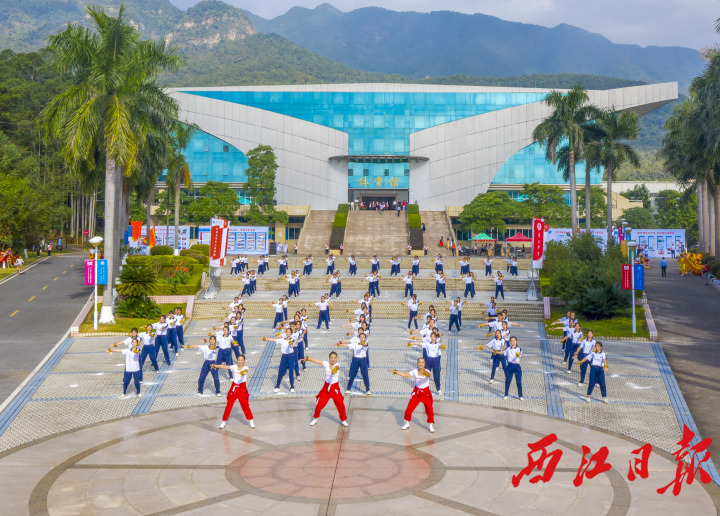 學生們在體育館前載歌載舞慶祝肇慶學院建校五十周年。 西江日報全媒體記者 曹笑 攝