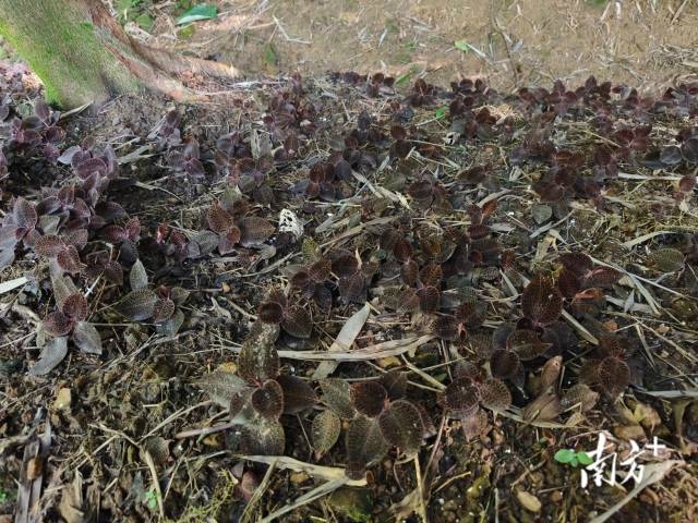 在肇慶四會市石狗鎮的一片野生樹林中,陽光穿過樹葉的縫隙,在一片種植地上投下晃動的光斑。地里所種植物名為金線蓮,是廣東、福建等地的傳統珍貴藥材,因其葉脈呈金色網狀而得名。