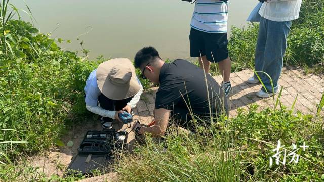 “四通清源·會綠興粵”實踐支隊成員使用便攜式檢測儀器對綏江水質進行實地檢測。