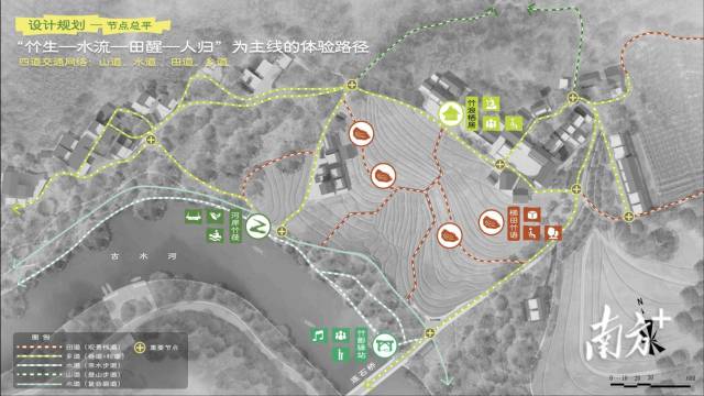 古水鎮位于廣東省西部,擁有古水河、竹林、梯田等豐富的自然資源和深厚的竹文化底蘊,具備發展生態旅游與特色產業的獨特優勢。針對當地解決旅游資源分散、文化體驗不足等問題,該團隊設計了山道、水道、田道、鄉道4種路徑將竹林、河流、梯田與村舍串聯。