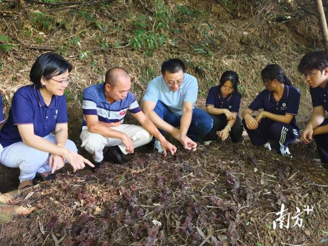 點草成“金”突擊隊與指導老師正在觀察金線蓮生長狀態。