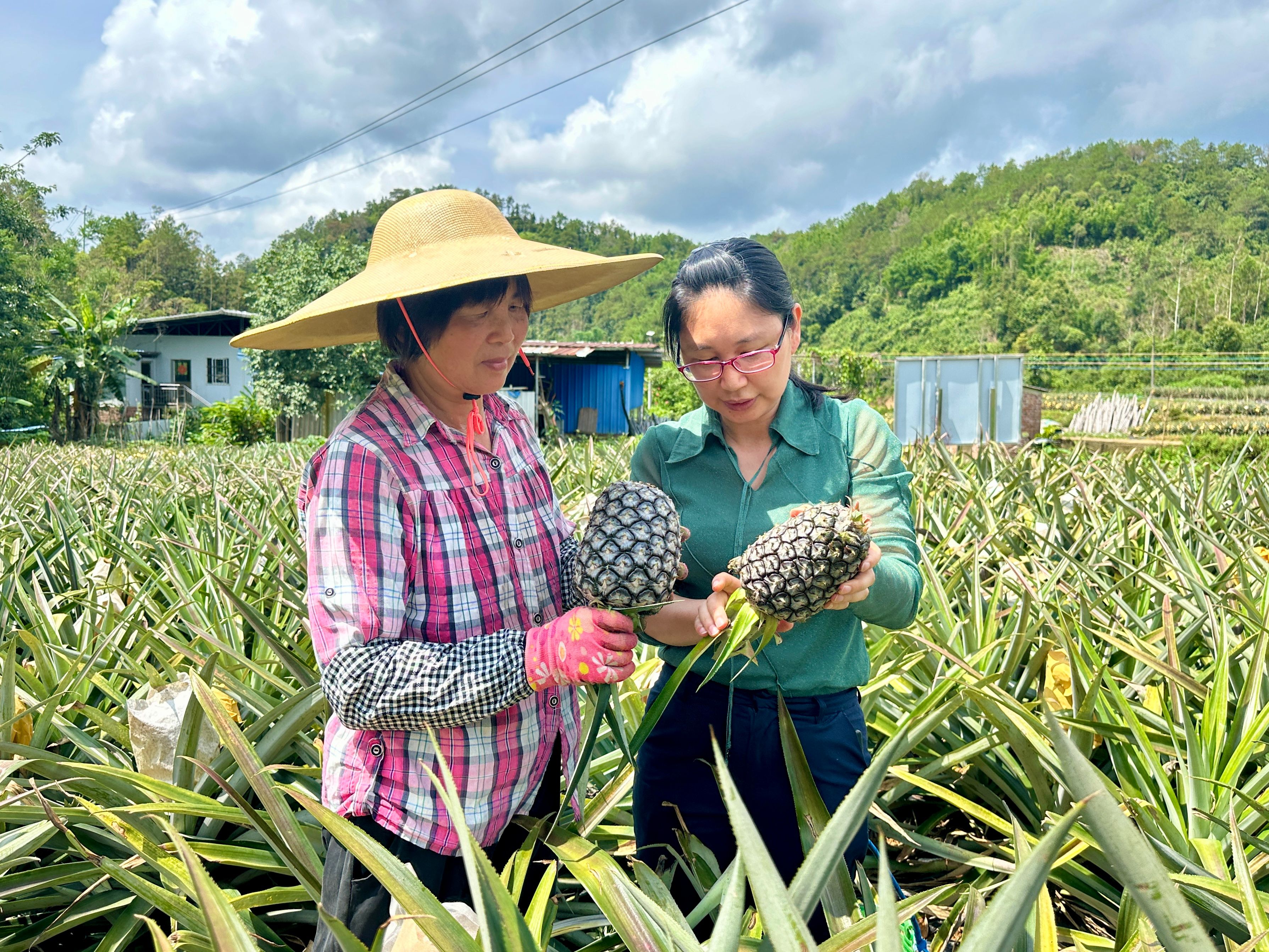 肇慶學院科技特派員吳秀蘭(右)在雙馬菠蘿種植基地了解情況