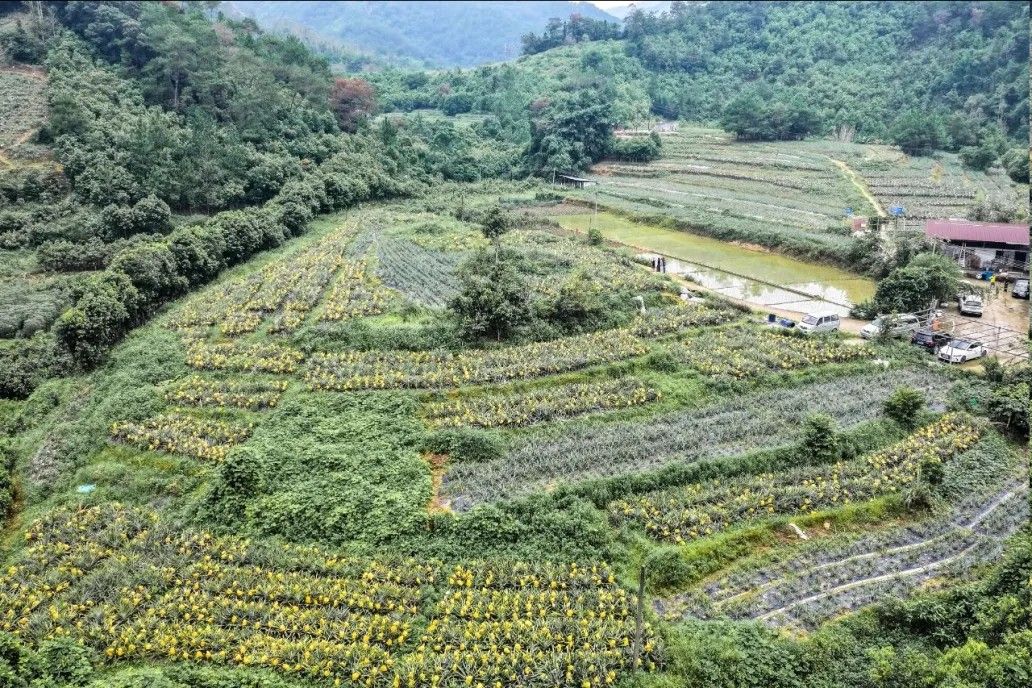 △位于祿步鎮雙馬村的雙馬生態農業種養基地,漫山遍野是成熟的菠蘿。陳彥成 攝