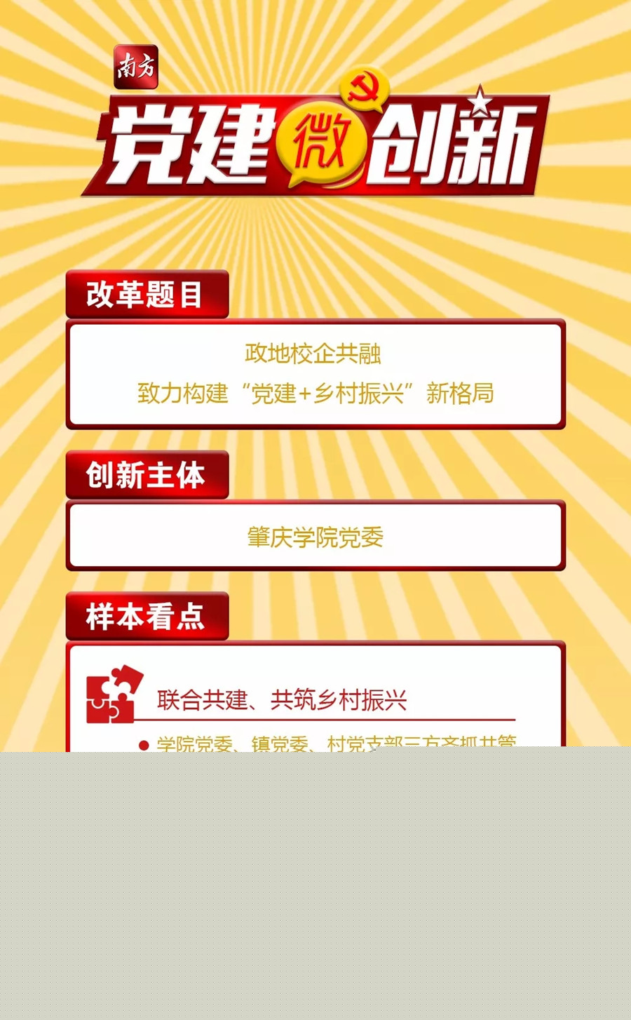 基層黨建,是黨的建設新的偉大工程的基礎工程。為深入學習宣傳貫徹黨的十九大精神,聚焦廣東基層黨建工作的改革亮點和創新經驗,《南方》雜志啟動《黨建微創新》系列全媒體專題,通過報道“小切口,有實效”的基層黨建改革樣本,推動廣東繼續發揮黨的建設在新時代的核心和統領作用。